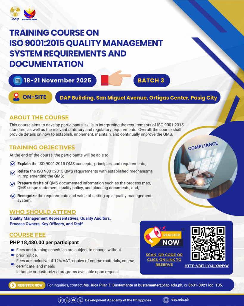 The Development Academy of the Philippines (DAP), through its Modernizing Government Regulations Program (MGRP), is set to present the key findings and emerging recommendations of its 2025 Regulatory Review in a virtual Public Consultation on 28 November 2025, from 1:30 PM to 5:00 PM, via Zoom. The consultation will highlight the results of DAP’s extensive engagements with stakeholders across priority sectors continue reading : DAP to Hold Public Consultation for the 2025 MGRP Regulatory Review