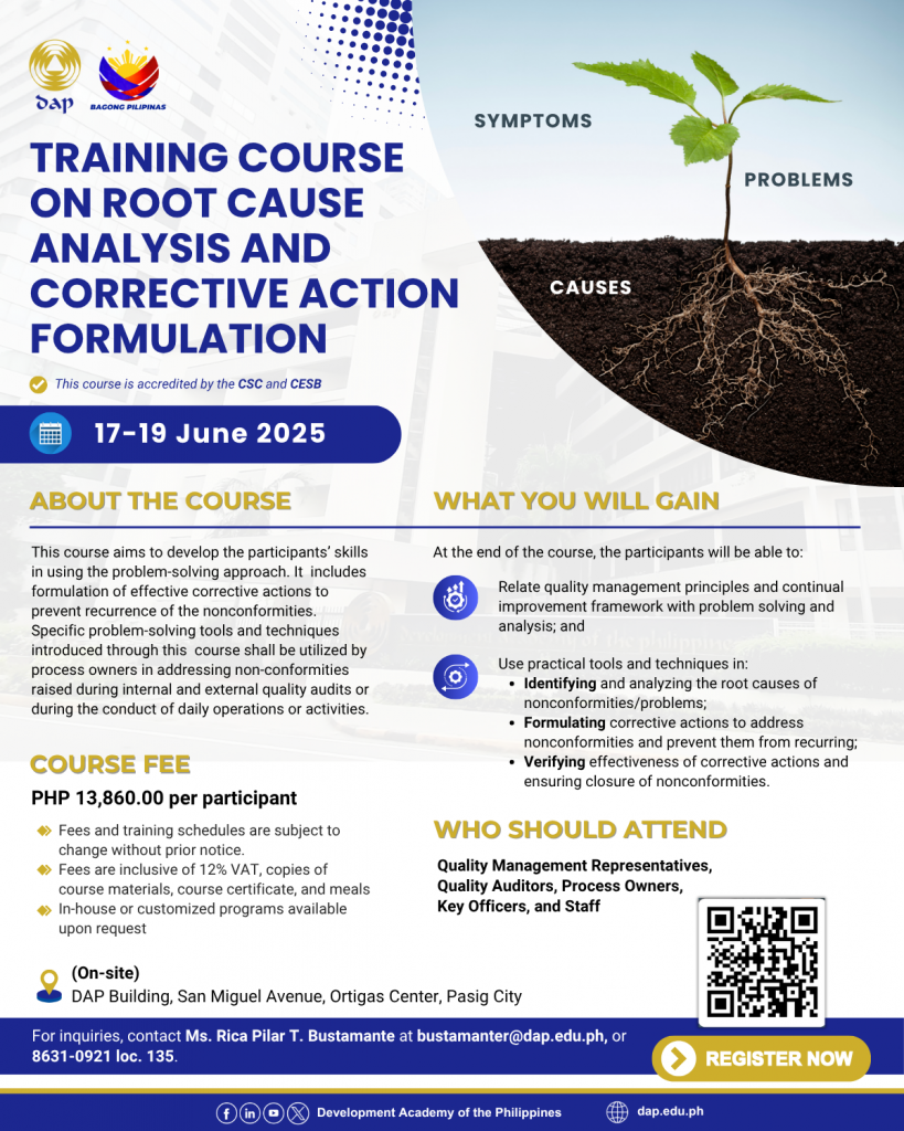 The Development Academy of the Philippines (DAP), through its Productivity and Development Center – Productivity and Quality Training Office (PDC-PQTO), invites you to the Training Course on Root Cause Analysis and Corrective Action Formulation (Batch 1) on June 17 to 19, 2025!